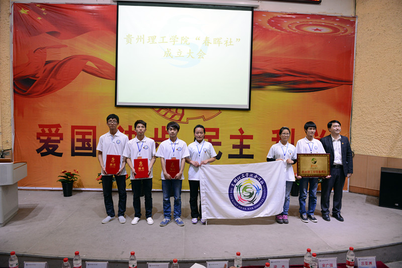 本网讯 5月4日晚,贵州理工学院春晖社成立大会在逸夫小报告厅举行。校领导曾羽、龙奋杰、梁杰、蒙忠、宋广强,团省委春晖行动发展中心吕亚洲主任出席成立大会。
